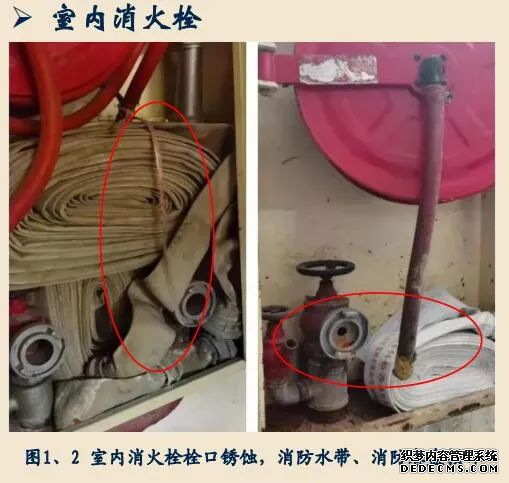 17、常见问题 消火栓箱内配件不齐全,出水栓口处锈蚀、消防水带和连接头老化、软管卷盘损坏,不能正常使用。