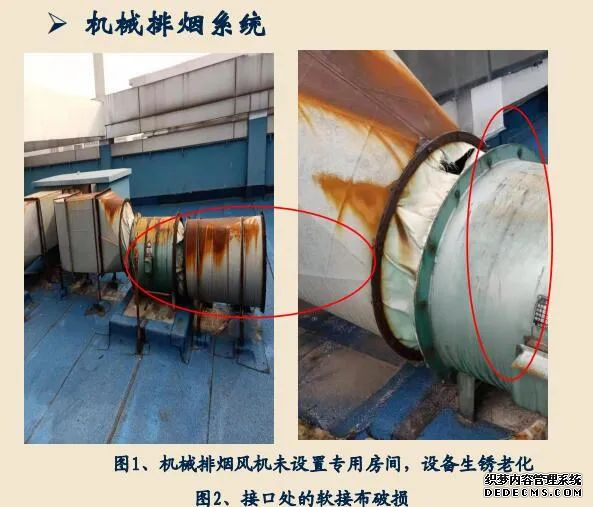 23、常见问题 机械排烟风机未设置在专用机房内,造成设施、设备生锈老化、接口软解布破损,影响正常使用。
