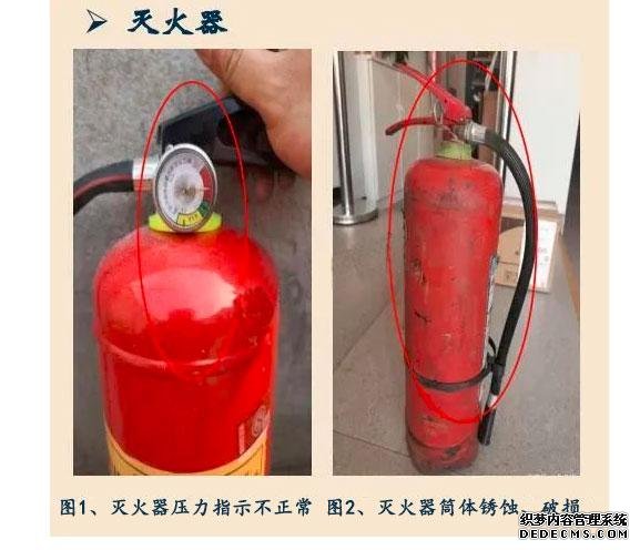30、常见问题 灭火器压力指示不正常,影响正常使用;灭火器筒体腐蚀、生锈或被开启使用过。